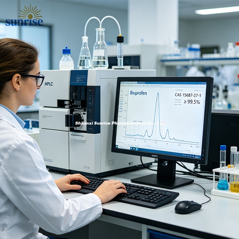 Buy high-purity Ibuprofen API (CAS 15687-27-1) ≥99.5% from Shaanxi Sunrise Pharmaceutical. GMP-certified, USP/EP compliant white crystalline powder for fever and inflammation R&D. Bulk supply and worldwide shipping. Request a COA today